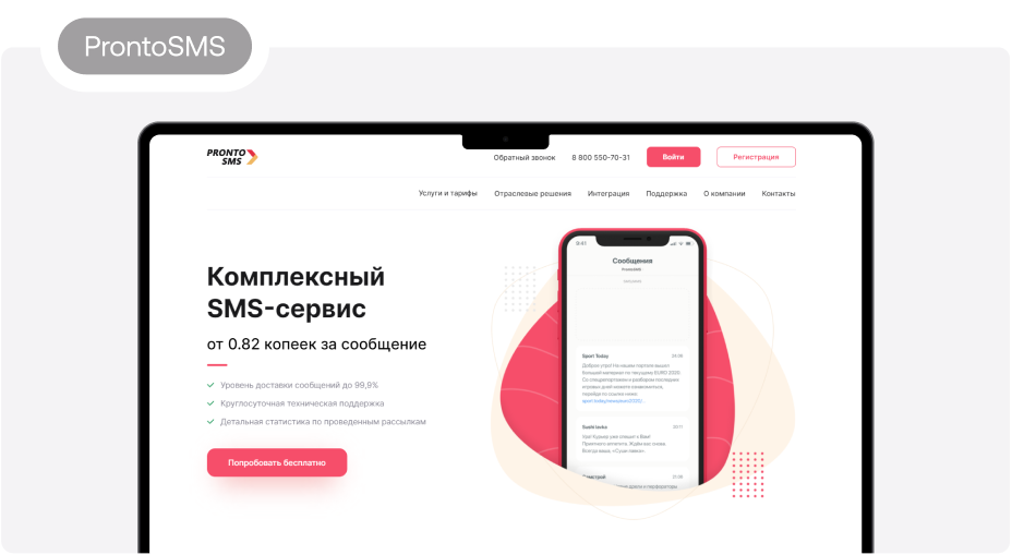 7. ProntoSMS. Платформа работает с рассылками по разным каналам — соцсети, электронная почта, мессенджеры и SMS. Стоимость сообщения — от 82 копеек. Техническая поддержка работает круглосуточно. Есть пробный бесплатный период. Сервис действует с 2012 года не только в России, но и за рубежом. ProntoSMS закрепляет за клиентами персональных менеджеров, предоставляет возможность автоматического редактировании базы и доступ к детальной статистике по выполненной задаче.