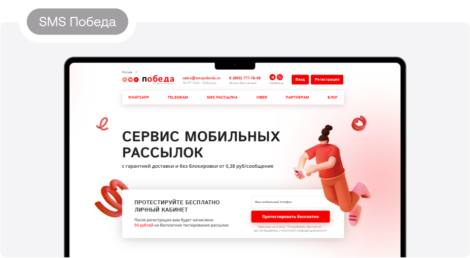 5. SMS Победа. Стоимость сообщения — от 38 копеек. Доступна отправка через мессенджеры. Сервис гарантирует защиту базы контактов. Рассылку можно делать по собственным или таргет-базам номеров. Предусмотрена опция «Турбо-SMS» с возможностью создания простого сайта, на который ведет ссылка из текста. SMS Победа предлагает сегментирование базы, функцию ее проверки с удалением устаревших и неактивных абонентов. Попробовать сервис можно бесплатно — после регистрации клиент получит бонусные 50 рублей.