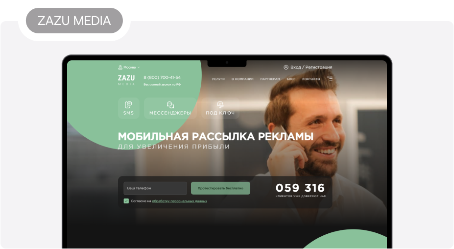 3. ZAZU MEDIA — платформа рассылки по SMS и в мессенджерах. Цена сообщения — от 59 копеек. Протестировать функционал сервиса можно бесплатно: после регистрации клиенту начислят бонусные 50 рублей. Запускать рассылку можно через мобильную или десктоп-версию. Предусмотрена возможность отправки сообщений под ключ: специалисты возьмут на себя подготовку текста, подбор и проверку базы номеров и другие задачи. Также доступна опция «Турбо-SMS» для увеличения конверсии. Можно за несколько минут сконструировать мини-сайт для приема заявок и дать ссылку на него в сообщении.