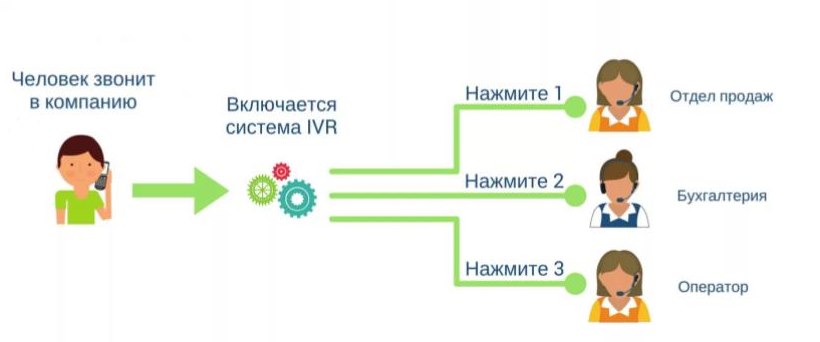 Виртуальная АТС включает IVR-меню, которое позволяет выбрать, с каким отделом связать клиента. Голосовое меню предлагает клиенту варианты и «привязывает» к ним цифры, нажав на соответствующую на своем телефоне, абонент автоматически переводится в подходящий отдел.