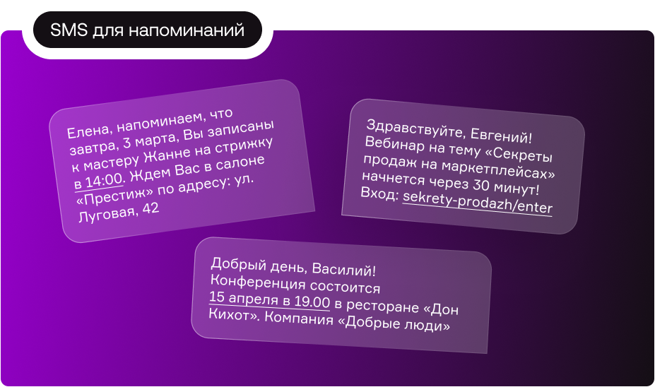 SMS-напоминания можно отнести к категории информационных сообщений. Они подсказывают клиенту, о каком событии ему нужно помнить. Это может быть запись к мастеру маникюра, предстоящий платеж или начало видеоконференции. Для таких уведомлений легко адаптировать шаблонные СМС — персонализировать их, указать основные детали и изменить контактные данные.