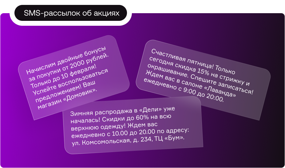 Шаблоны для СМС-рассылок помогают экономить предпринимателям время и деньги. Создать такие тексты-конструкторы можно по самым разным поводам — для приглашения на мероприятия, предложения скидки в обмен на подписку, приветствия клиента после регистрации, уведомления о старте распродаж и не только. Готовые шаблоны можно адаптировать для любой сферы — служба доставки, интернет-магазина, ресторана и т. д.